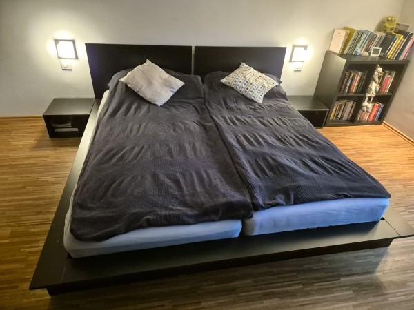 črna, stabilna, v notranjosti kovinski okvir, 2x nočna omarica zraven in 2 x letveno dno.