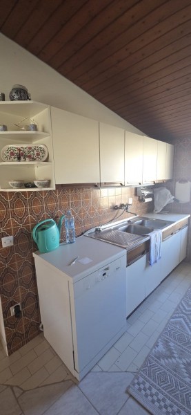 Kuhinja je starejši model, a lepo ohranjena - dve strani z zgornjimi in spodnjimi omaricami/predali ter stranski poličnik.