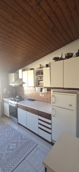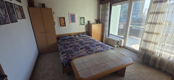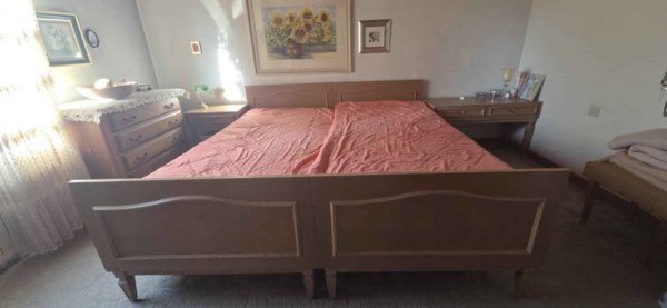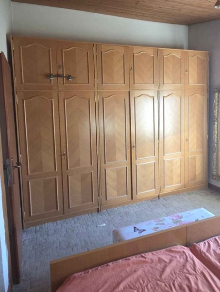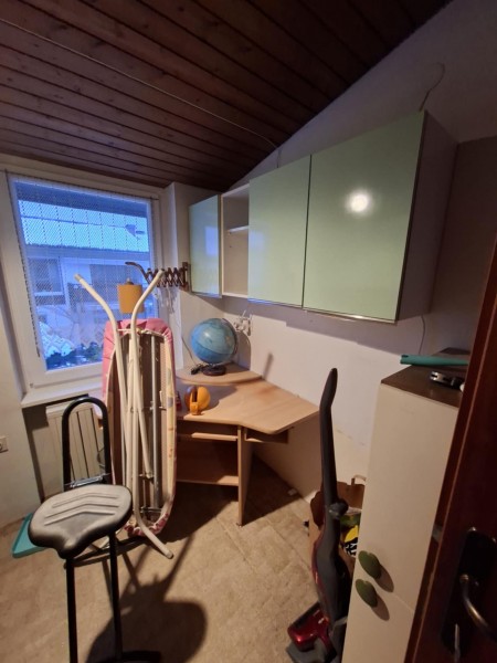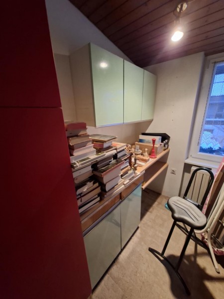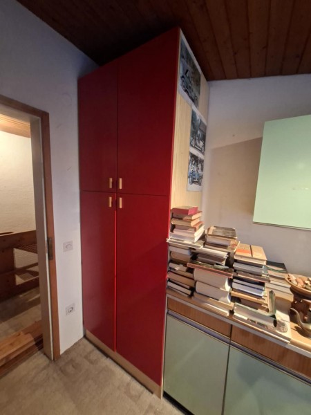 starejša kuhinja brez aparatov + umivalnik, večja garderobna omara, velika postelja z vzmetnico, manjša spalnica (večja omara, mala omara, postelja z vzmetnico), velika rdeča omara, dodatni zgornji in spodnji kuhinjski elementi (svetlo zelena), kotna pisalna miza