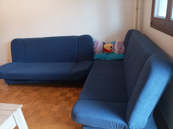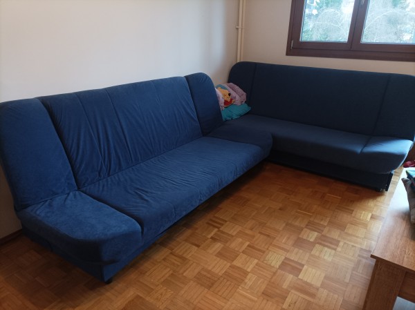 Kavča sta stara deset let in sta bila v uporabi le občasno. Sta temnejše modre barve in nista poškodovana. Oba sta dolga 205cm in raztegnjena široka 120cm.