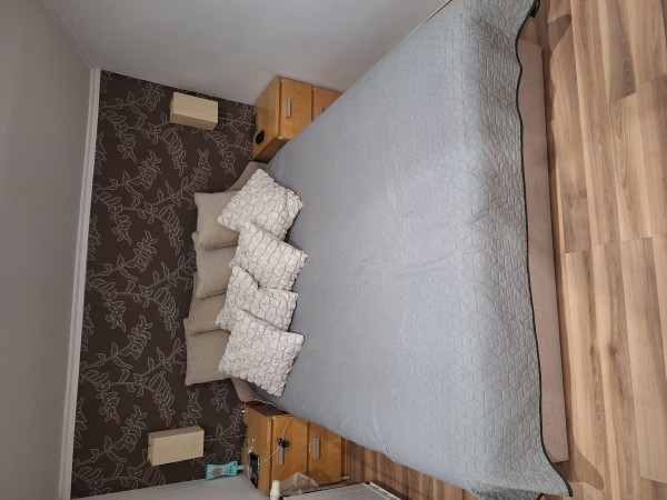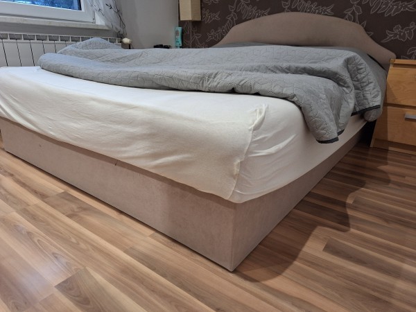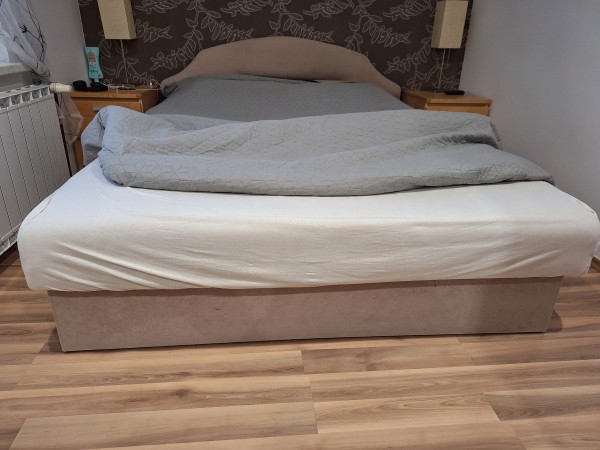 Zakonska postelja dimenzije 160 x 200 cm, siva, blago, s predalom, ohranjena!!!