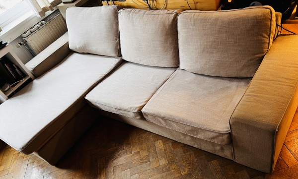 3 leta stara, dobro ohranjena, snemljive, pralne prevleke. https://www.ikea.com/si/sl/p/kivik-3-seda-zofa-s-pocivalnikom-tresund-svetlo-bez-s79482840/#content.
