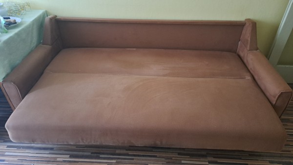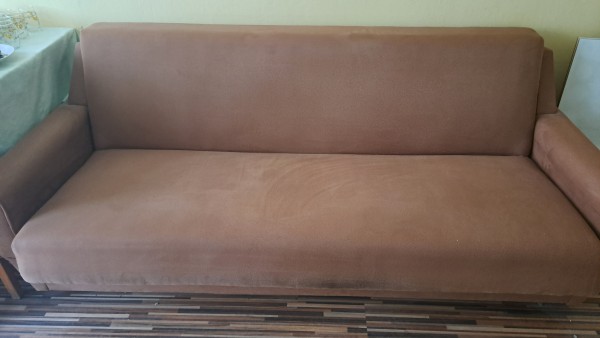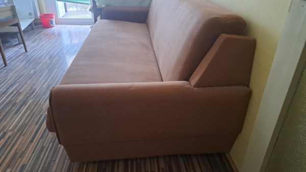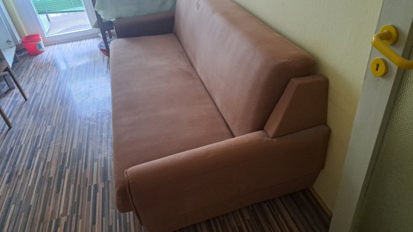 Kavč, cca 200 cm, rjav, mikrovlakna, v dobrem stanju, lahko se raztegne v ležišče.