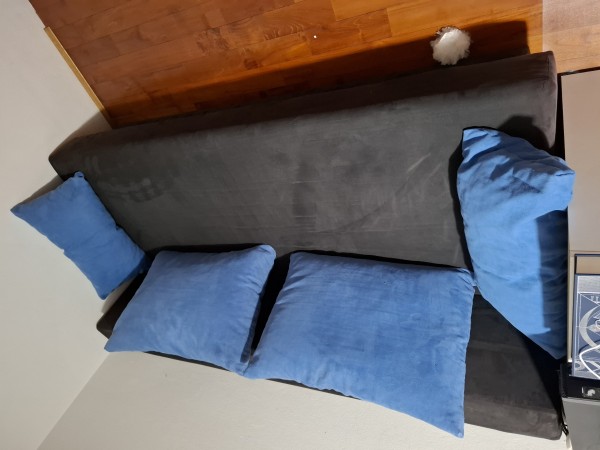 Črn, raztegljiv, z modrimi blazinami, iz tkanine.