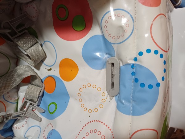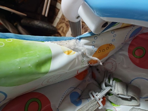 Prav tako je odrezan pašček, s katerim naj bi privezali otroka. Sicer mislim, da je to odveč in otrok iz stolčka ne more pasti, saj je zagrajen z mizico.