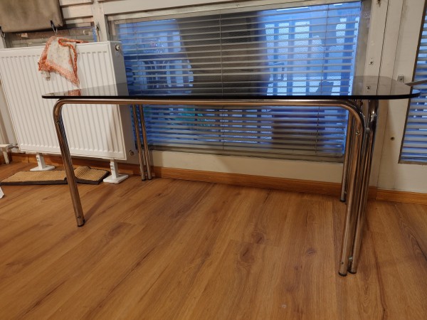 Klubska mizica. Steklena površina je samo postavljena na ogrodje, zato je na sliki zamaknjena. Dimenzije 120x65x55cm. Na enem mestu je malo okrušena.
