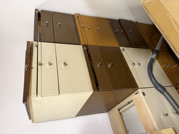 Predali za pisarno ali delavnico. 12 kom. Les masiva.predale se lahko vijači pod pisalno mizo, ali pa na steno v delavnici. So v treh barvah - les rjava, svetlo rjava in bež.