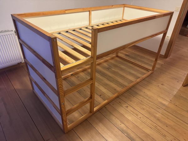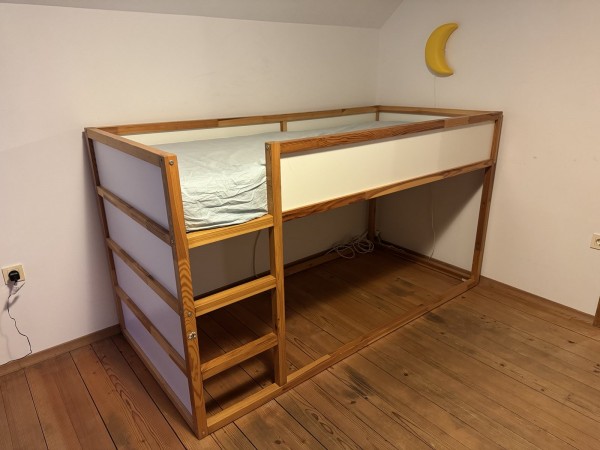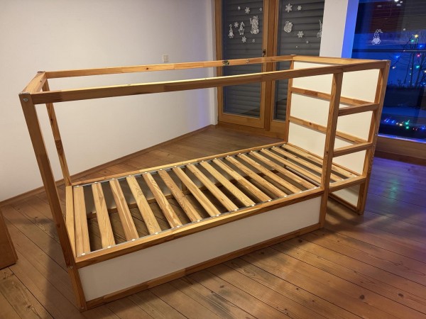 Podarimo otroško posteljo, ki je lahko postavljena na višini ali se obrne, da je ležišče spodaj, vključno z letvicami. Dodamo tudi baldahin z motivom džungle in jogi.