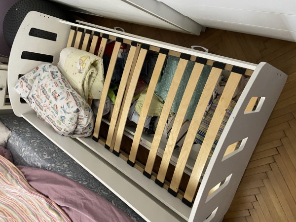 Podarimo otroško posteljo s predalom, vključno z letvicami. Dimenzija 80 x 160. Zraven sta tudi jogi in posteljnina.
