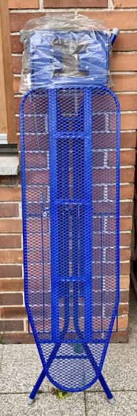 Z nastavljivo višino in držalom za likalnik, modre barve, kot na sliki.