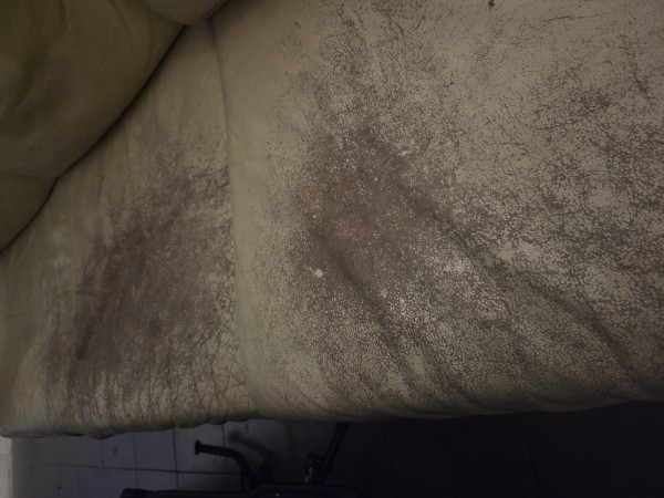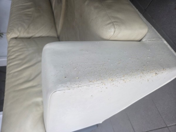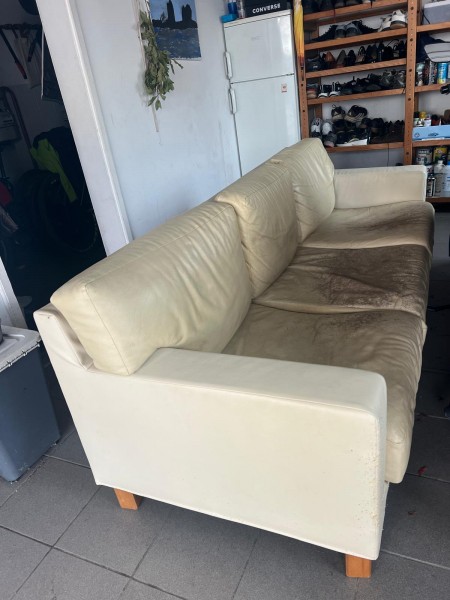Usnjen trosed, barve bel-krem, velikost 230*90cm, sedalni del obrabljen, ena stranica poškodovana.