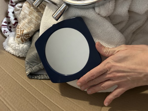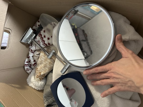 Dve ogledali, eno stensko (brez vijakov) in eno manjše, ki se je odlomilo od podatavka. Obe imata na eni strani "običajno", na drugi strani povečevalno ogledalo.