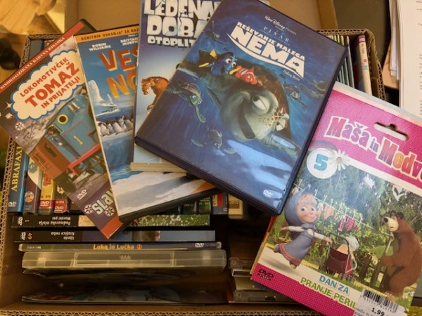 Podarim škatlo risank in risanih filmov na DVD-jih (Ledena doma, Tomaž in prijatelji, Vesele nogice, V višave, Dežela ponijev...)