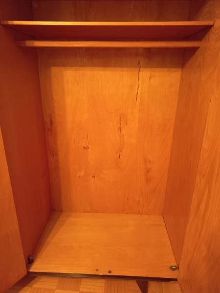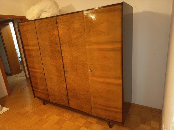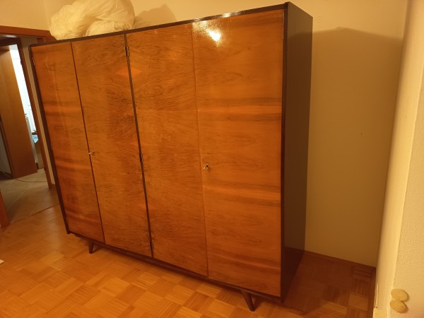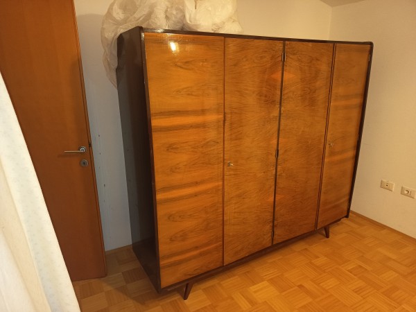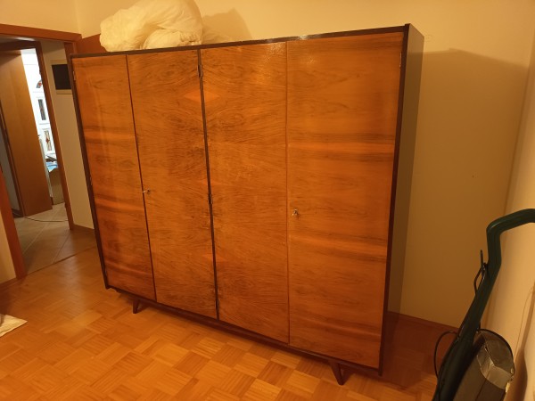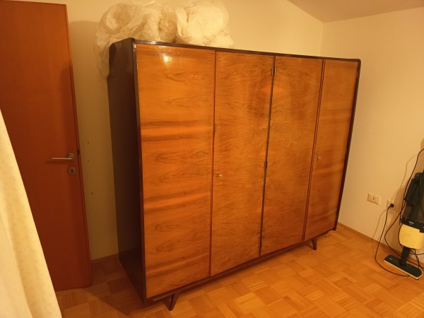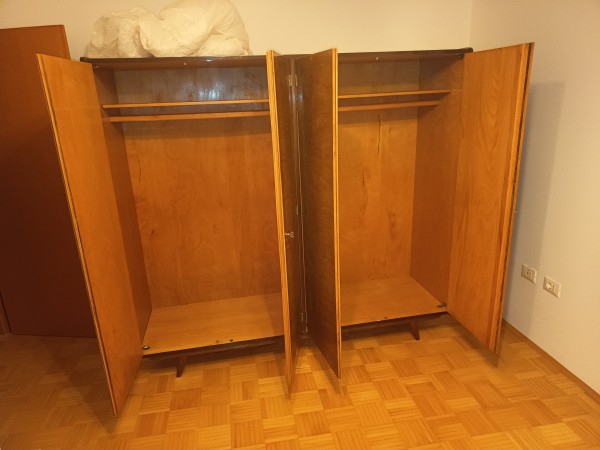 Dvodelna omara. Štiri vrata z eno polico zgoraj in s palico za obešalnike. Omara starega tipa rjave barve.