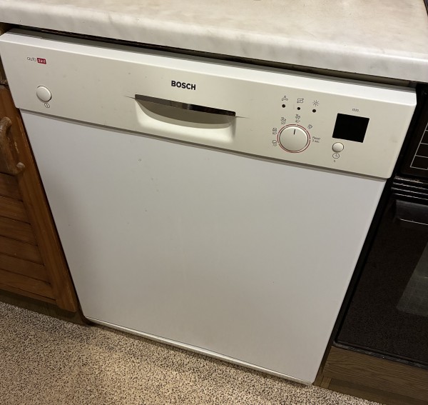 Pomivalni stroj bele barve. Gre za starejši model, ki še vedno dobro dela.
