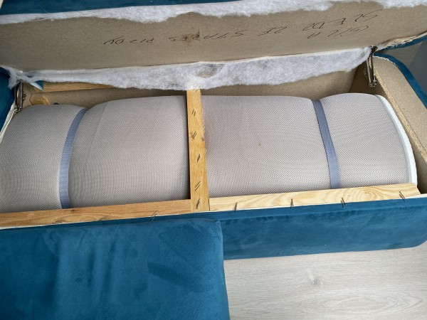 Kavč, raztegljiv, brez blazin in z dodatno nadvzmetnico ter taburejem. Ko je raztegnjen postane lezišče velikosti 190x140, za boljše udobje spanja pa prilagamo še nadvzmetnico enakih dimenzij iz spominske pene.