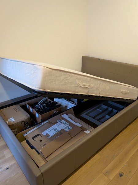 Postelja velikosti 140x200cm z jogijem. Postelja ima vzmet in shranjevalni prostor pod jogijem. Naslonjalo ima znake obrabe.