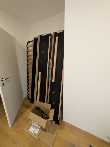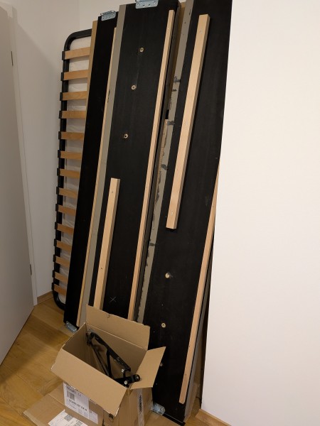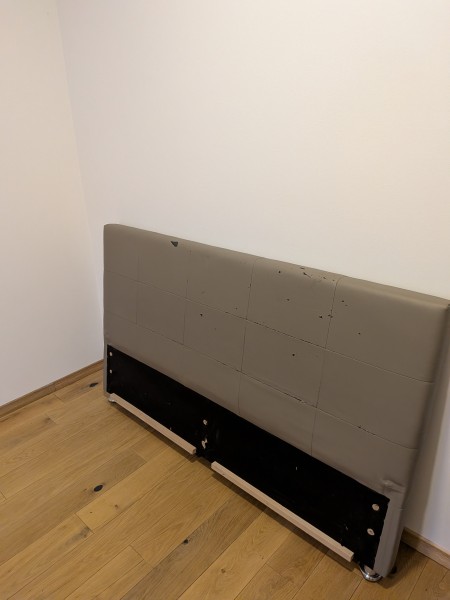 Postelja je v solidnem stanju, vidni so znaki obrabe na slikah.