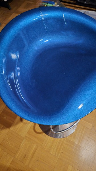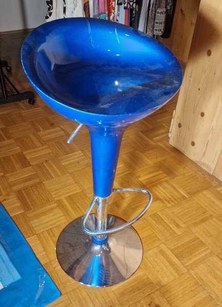 Kovinsko modre barve, srebrna noga. Nastavljiv po višini.Stol ima nekaj prask.