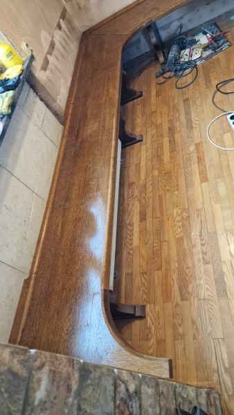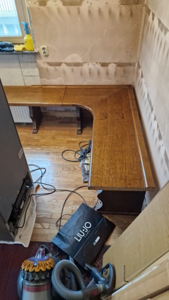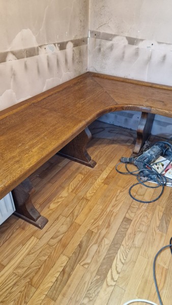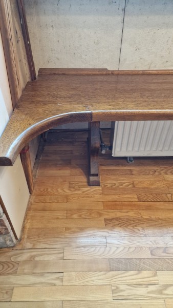 Kotna klop: višina 46,5 cm, globina 45 cm, debelina 4 cm. Posamezno: Kratka je dolga 160 cm in druga je dolga 204 cm, narejeno pri mizarju, hrastov furnir.