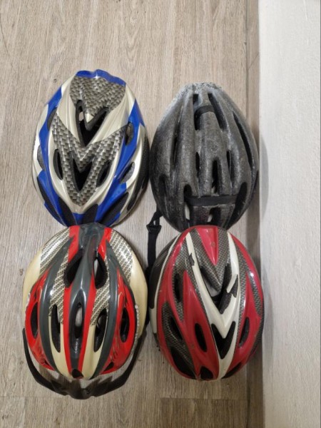 Štiri dobro ohranjene in še popolnoma varne kolesarske čelade, različnih barv.