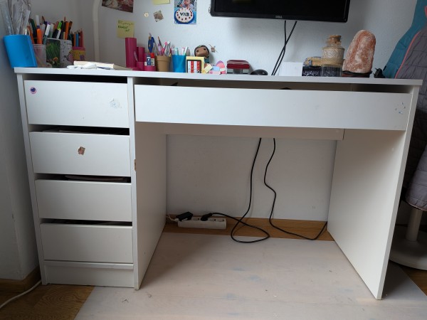 Mladinska pisalna miza s predali. Dimenzije: 120x55 cm. Preprost dizajn, kupljena pred sedmimi leti.