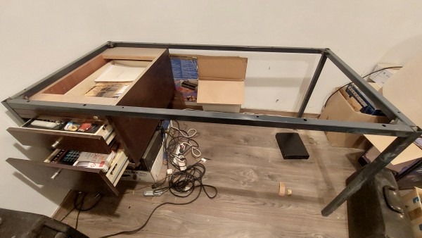 Ogrodje je močno, stabilno kovinsko s predalnikom z dvama predaloma, en manjši in en velik. Mizna plošča je najbrž iz iverke, furnirana, tudi dosti masivna in težka, tako da se mirno uporablja kot delavniški pult, za v klet i.p.d. Dimenzije plošče: cca 150x75x2cm. Lahko odnesete samo ogrodje, ali ploščo z ogrodjem.
