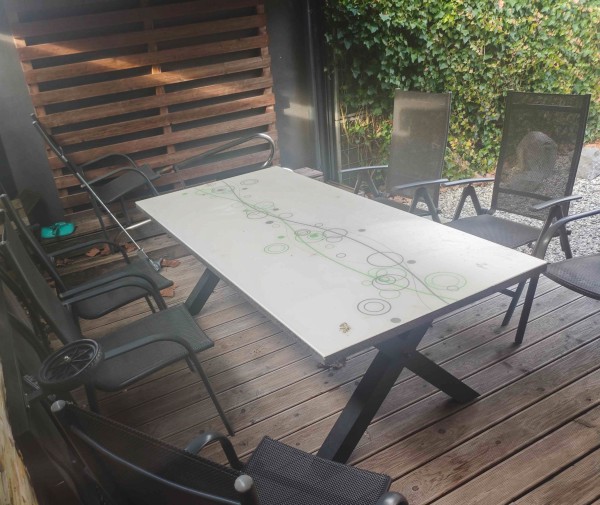 Miza: velikost: 200cm x 100cm x 74cm. Zunanja jedilna miza s kaljenim steklom. Hitro se opere, nič se ne prime, in zelo stežka se zlomi. Rabljena.