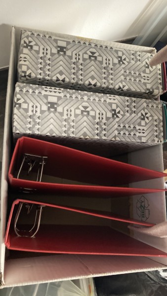 4 široki fascikli za A4 format, dva plastična rdeča, dva kartonska s škatlo, zelen in roza.