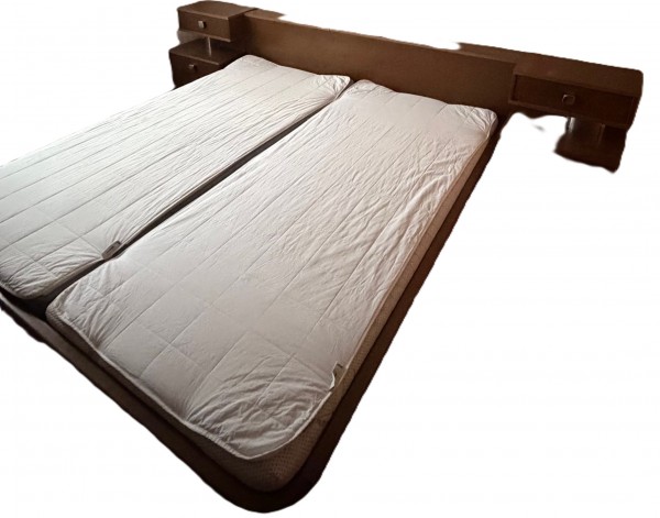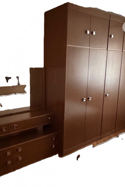 Rabljena spalnica z omarami, zakonsko posteljo, nočnima omaricama in predalniki.