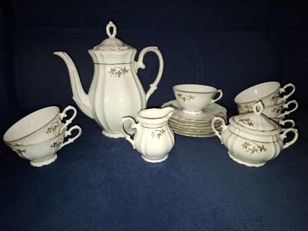 Čajni servis. Čajnik, sladkornica, vrček za mleko, 6 skodelic in 6 krožničkov. Kvaliteten porcelan, odlično ohranjen in nepoškodovan.