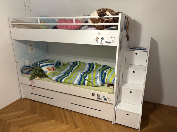 Za dostop do zgornje postelje ima stopnice, v vsaki od stopnic je tudi "omarica", prostor za shranjevanje. Prav tako sta spodaj pod dodatnim ležiščem še dva izvlečna predala.