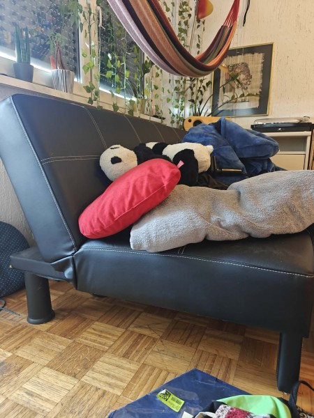 Podarimo črn kavč iz umetnega usnja, brez naslonov za roke, click-clack. Cilindrične noge