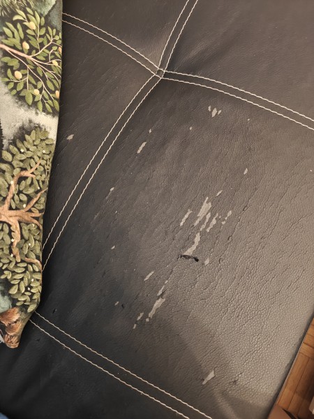 Na fotografiji vidni znaki uporabe, trganje semiša in par lukenj. Vse popravljivo s prevleko.