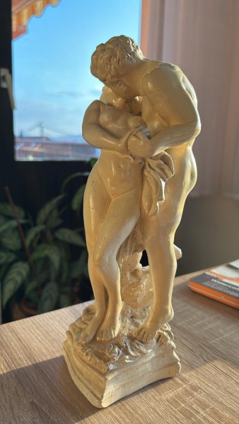 Dekorativni kipec dveh ljubimcev v poljubu, izdelan v elegantnem klasičnem (neoklasicističnem) slogu, išče novega lastnika.