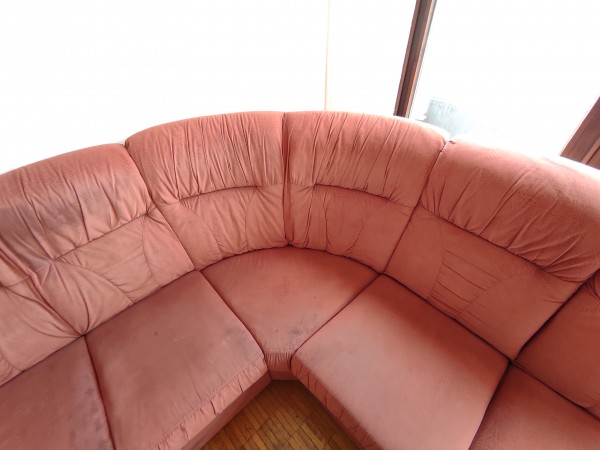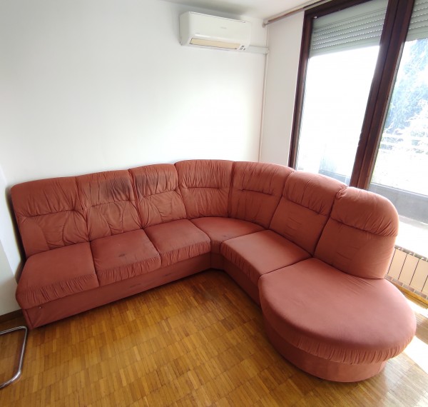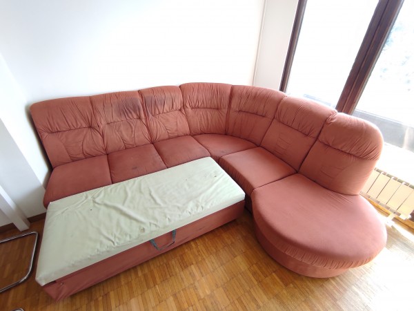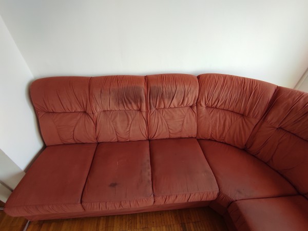 Kavč, rdeč, cca. 240 x cca. 240 cm, kar dobre izdelave, a blago je znucano. Raztegljivo ležišče ima nekaj lukenj od cigaret. Celoten kavč ima vonj po cigaretnem dimu, ki bo prisoten vedno (v dnevni sobi se ni kadilo zadnji dve leti, bil je tudi globinsko očiščen, a vonj ostaja).