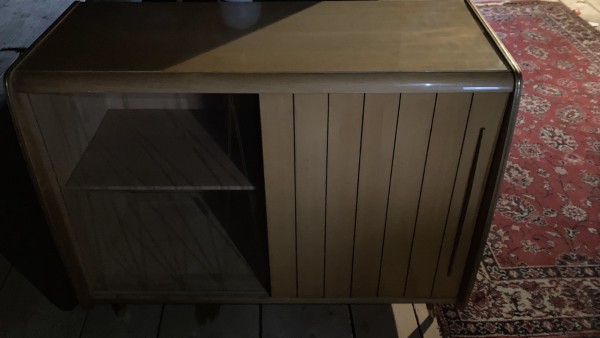 Podarim nizko leseno omarico z drsnimi vratci in vitrino, notri sta 2 polici. Dobro ohranjena v retro slogu. PIŠITE SMS, ne kličite.