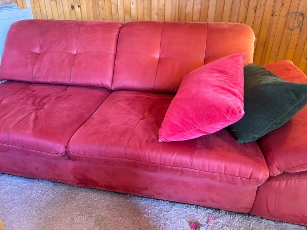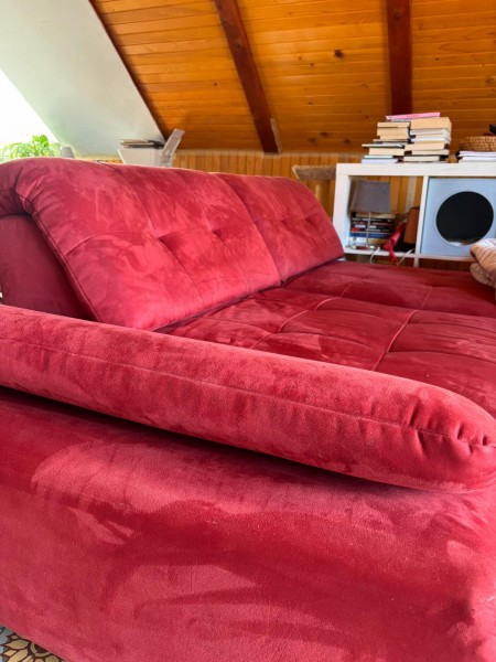 Večji, udoben kavč rdeče barve z mikrofibra prevleko, dolžine 4 metre.