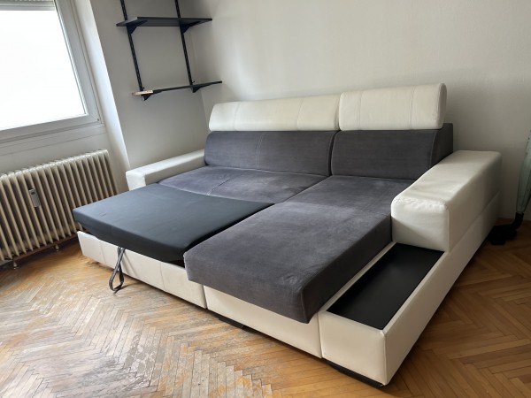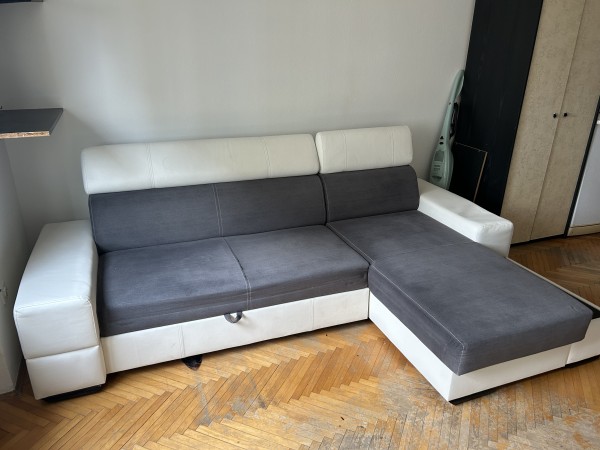 Podarim udobno sedežno garnituro in pripadajočo mizico. Iz osrednjega dela se raztegne ležišče. Del kavča se dvigne, spodaj je prostor za shranjevanje. Kavč je bil globinsko očiščen in nima madežev. Pridete, razstavite in odnesete.