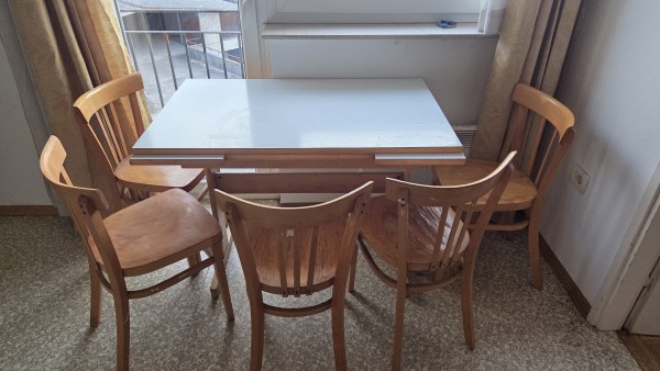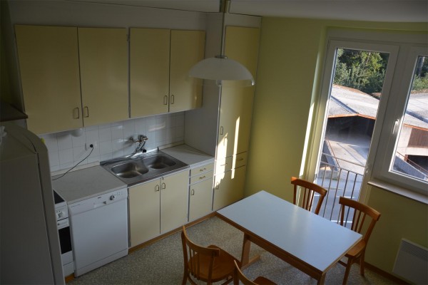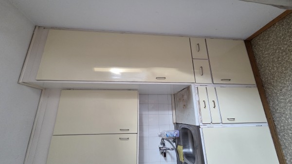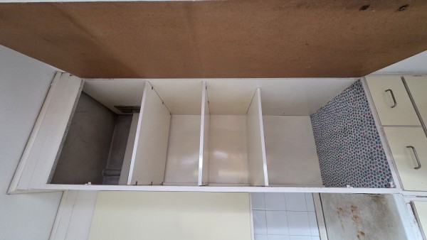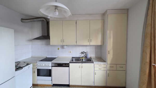 Kuhinja je stra, na pultu so zažrti madeži, omarice okoli korita so slabše ohranjene zaradi vlage. Nekateri stoli so slabše ohranjeni.
