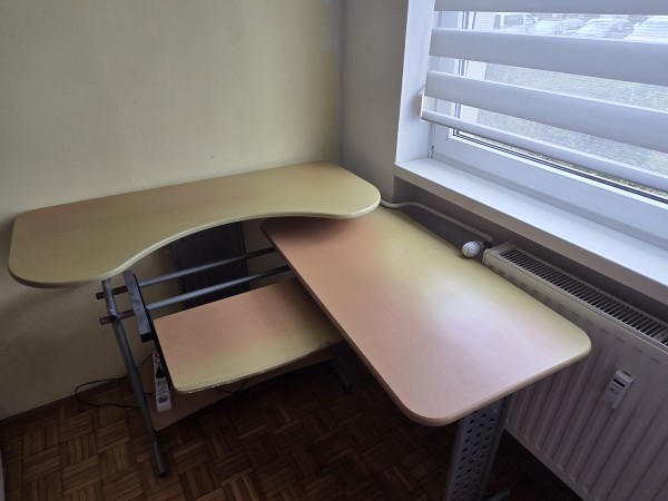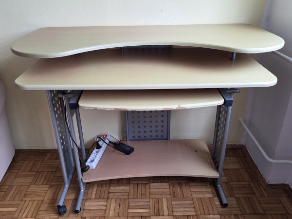 Barva mize beige, je sestavkjiva, z izvlečno podlago za tipkovnico ali prenosnik.