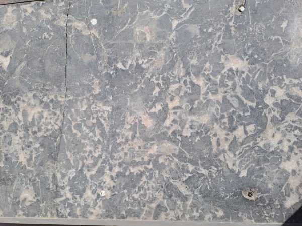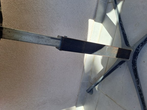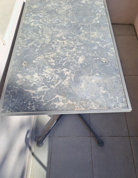 Plošča ima razpoko, kot je vidno na sliki, kar pa ni moteče, saj je mizica normalno uporabna. Plošča ima tudi kovinski okvir, kar jo dodatno utrdi.