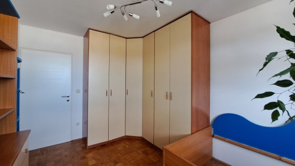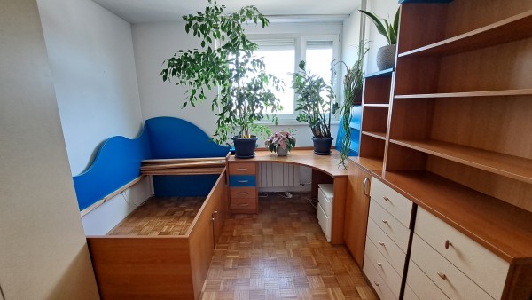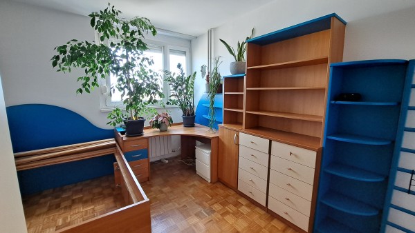 Sestavljajo jo postelja, pisalna miza, komoda in velike vgradne omare z obilico prostora za shranjevanje.