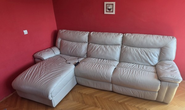 Podarim usnjeno sedežno kotno garnituro v bež barvi, dimenzije 2,80 m x 1,70 m, globine 0,9 m. Oba sedeža imata dodatno funkcijo počivalnika.