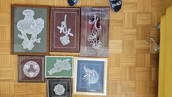 7 umetniških čipk, vse so v okvirju.