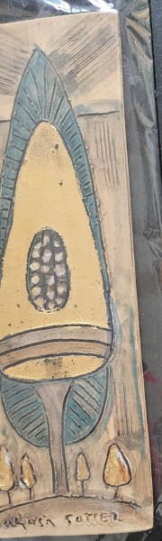 Umetniška keramika, Aljoša Sotler, keramika na lesu. Velikost 45 x 16 cm.