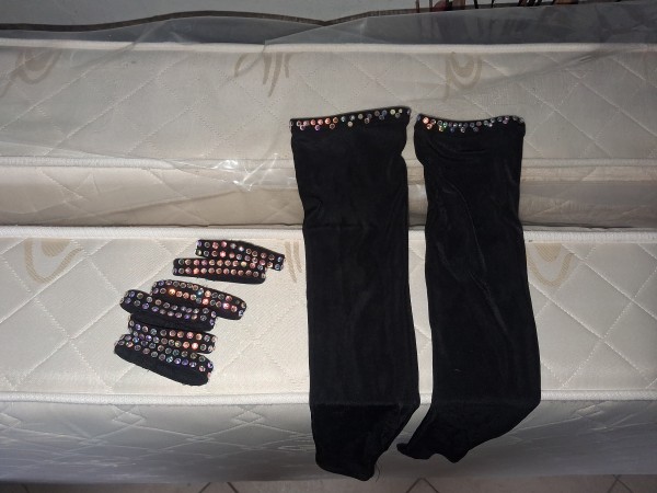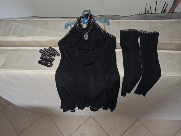 Podarim dekliško plesno obleko za latinsko ameriške plese, črne barve, z rokavicami in zapestnicami in dekliško plesno obleko za standardne plese, svetlo zeleno-temno zelene barve. Obe sta za velikost 150 do 160 cm.