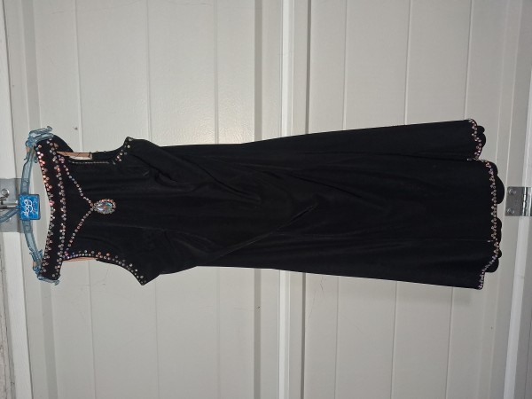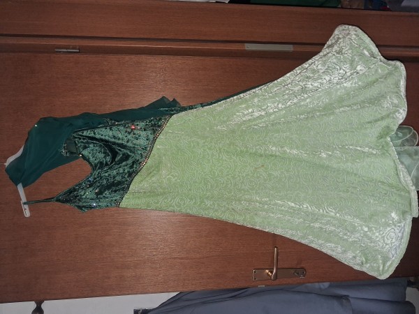 Podarim dekliško plesno obleko za latinsko ameriške plese, črne barve z bleščicami, vključno z rokavicami in zapestnicami in plesno obleko za standarne plese svetlo-temno zelene barve. Obe sta za velikost 150 do 160 cm.