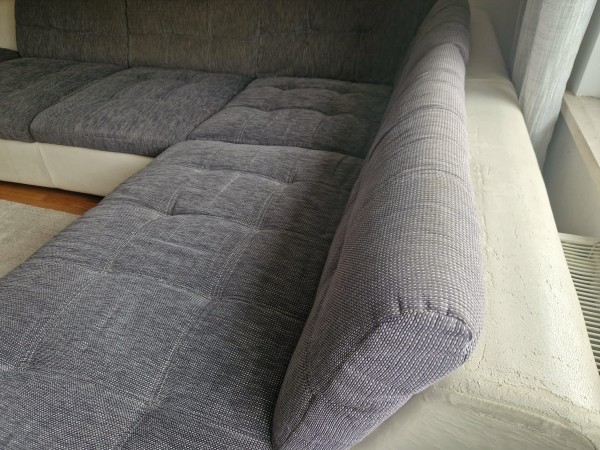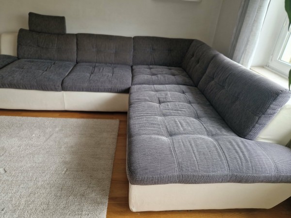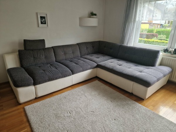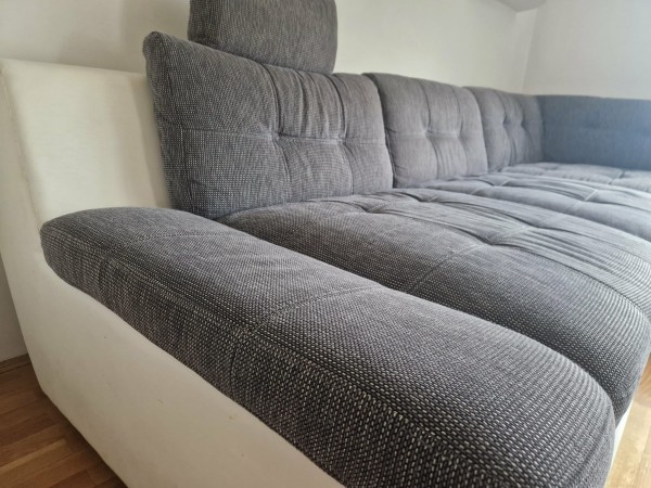 Sedežna garnitura kot na sliki. Dimenzije 290x240cm. Sestavljena je iz dveh delov, ki se sestavita skupaj. V daljšem delu ima spodaj raztegljivo ležišče. Sami poskrbite za prevoz.