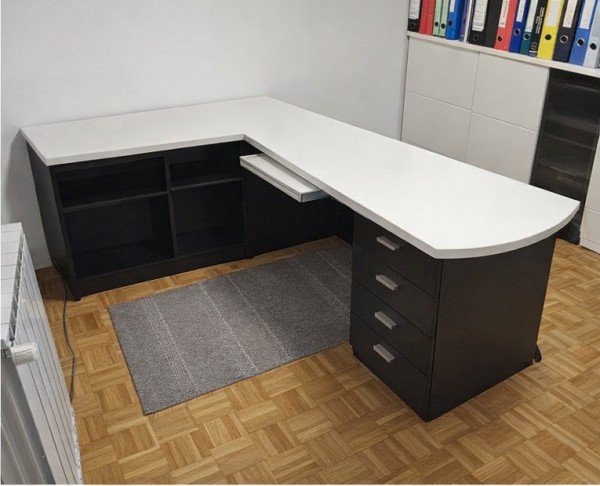 L oblikovana pisalna miza 165 x 210 cm. Mizi pripada omara, ki se ob mizi obesi na steno (jaz je trenutno nimam obešene na steno). Na sliki je za mizo.